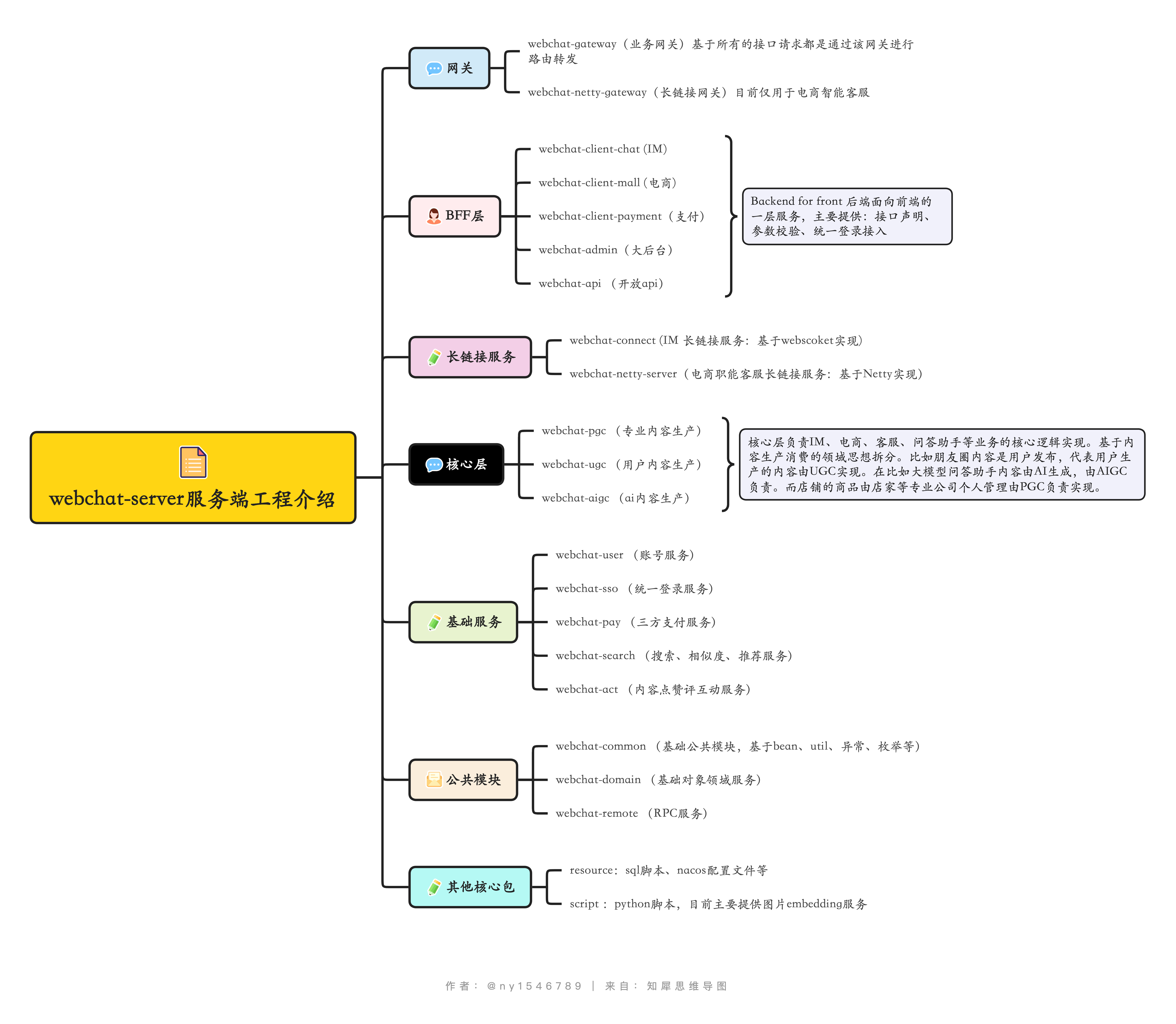 前端服务比较简单,这里就不单独介绍啦。后段服务因为模块比较多,可以了解下分层微服务拆分思想和各模块职责。